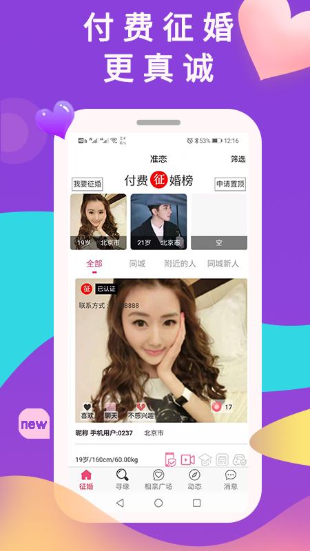 【征婚信息】:真人征婚信息,付费后征婚资料才能进行展示,更真实可信。同时可以选择填写你的电话号码,让别人直接联系你。