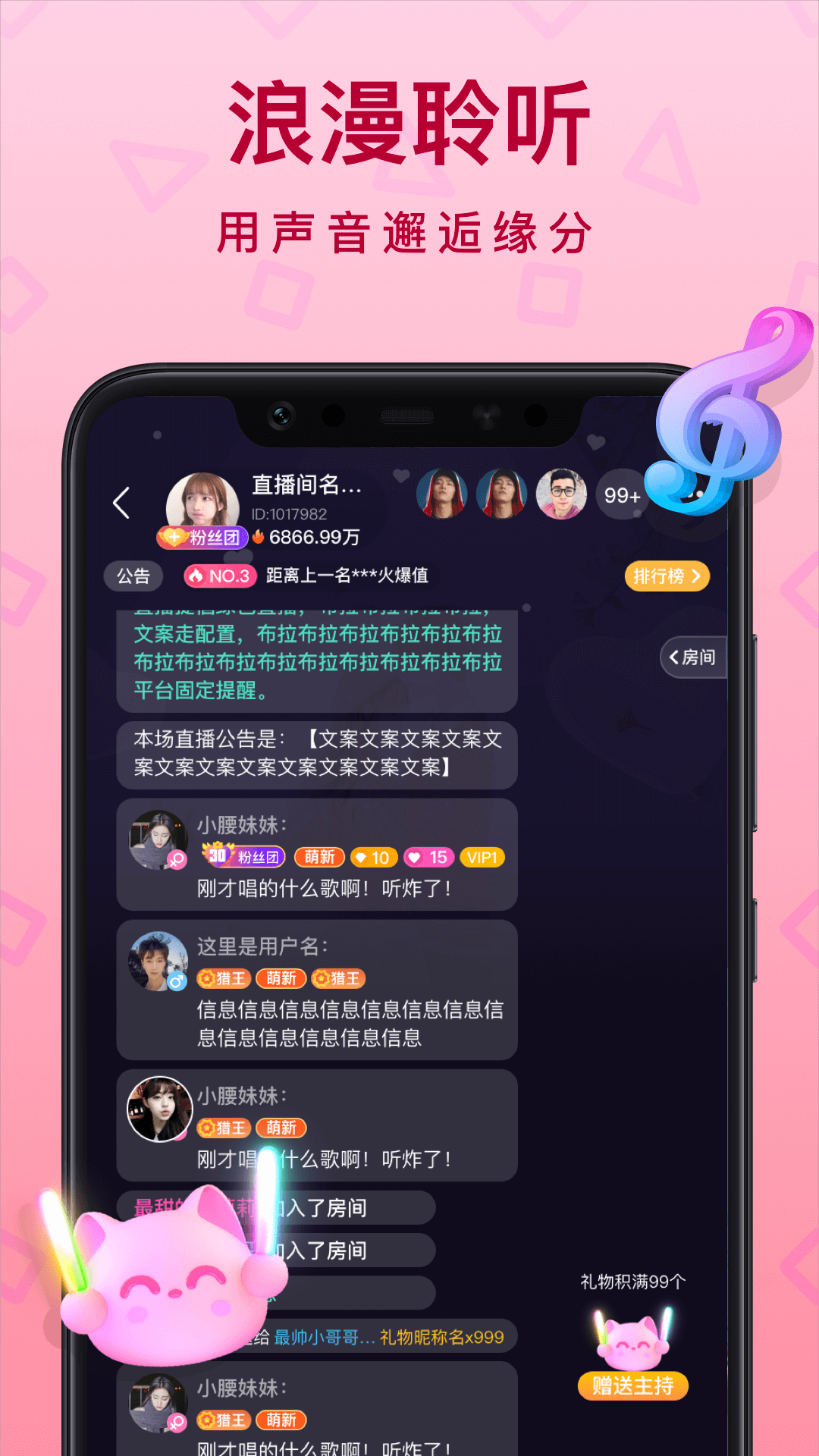闲聊语音房,为素人主播提供读文与好歌分享的电台场景;为pia戏爱好者提供跨越地区限制的同台飙戏场景,为优质声优提供交流机会。主持人全程在线,嗨聊不断。