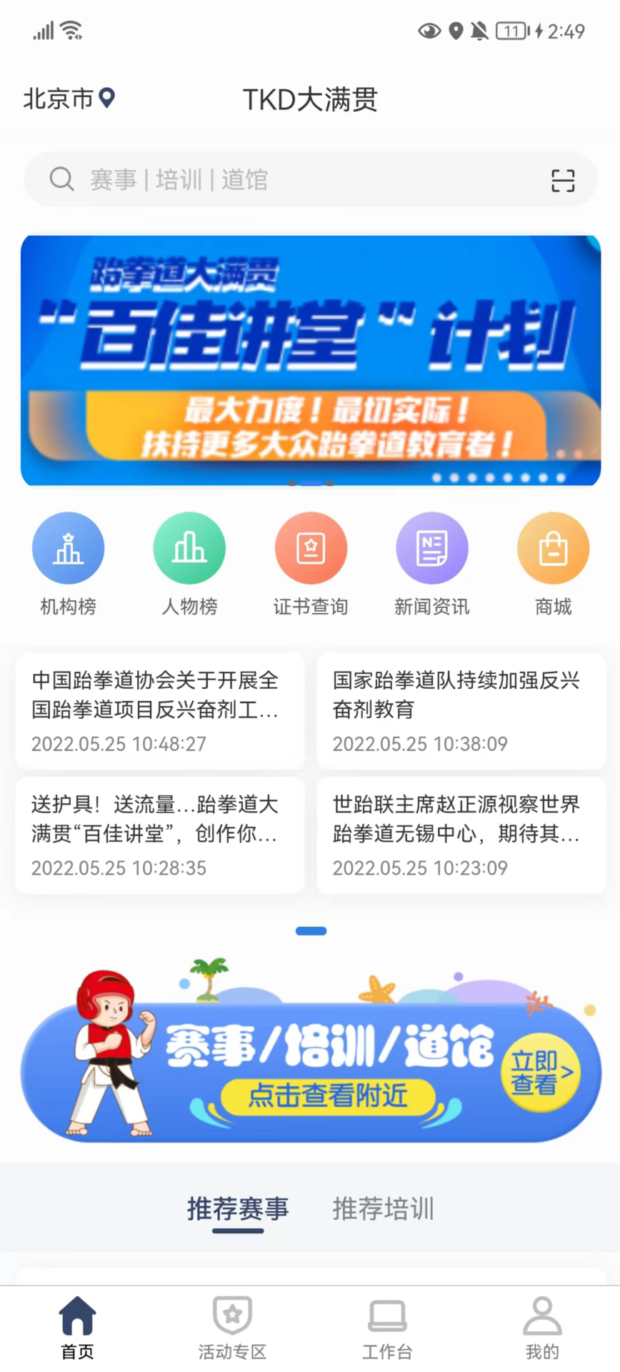 跆拳道大满贯数字化管理平台主要解决跆拳道比赛各业务流程处理,覆盖赛事管理、后勤管理、培训考试、商城及道馆管理等功能。系统通过活动专区找寻适合登录者感兴趣的赛事与培训计划,在线上可完成报名、报项,缴费等功能,通过工作台完成与登录账号绑定的身份标签功能,包含赛事中的检录员、培训考试中的成绩录入员,道馆中的教练、家长,完成在道馆中签到,生成学员报告、预约课程、查询学员信息等功能。同时登录者在登录个人中心后,可查看在当前平台的账户信息,职业信息、级段位信息以及培训考试记录。财神爷站提供跆拳道大满贯数字化管理平台app官方版下载地址,有需要的用户可免费下载使用!