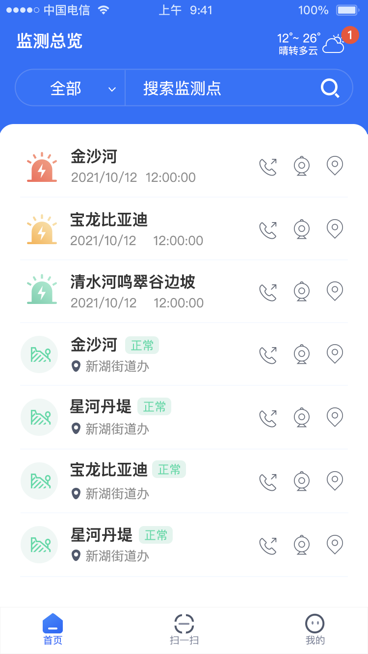 3、监控设备运行状态显示、巡检记录、隐患点一键导航、警示通知、历史警示、电子报告等功能模块。
