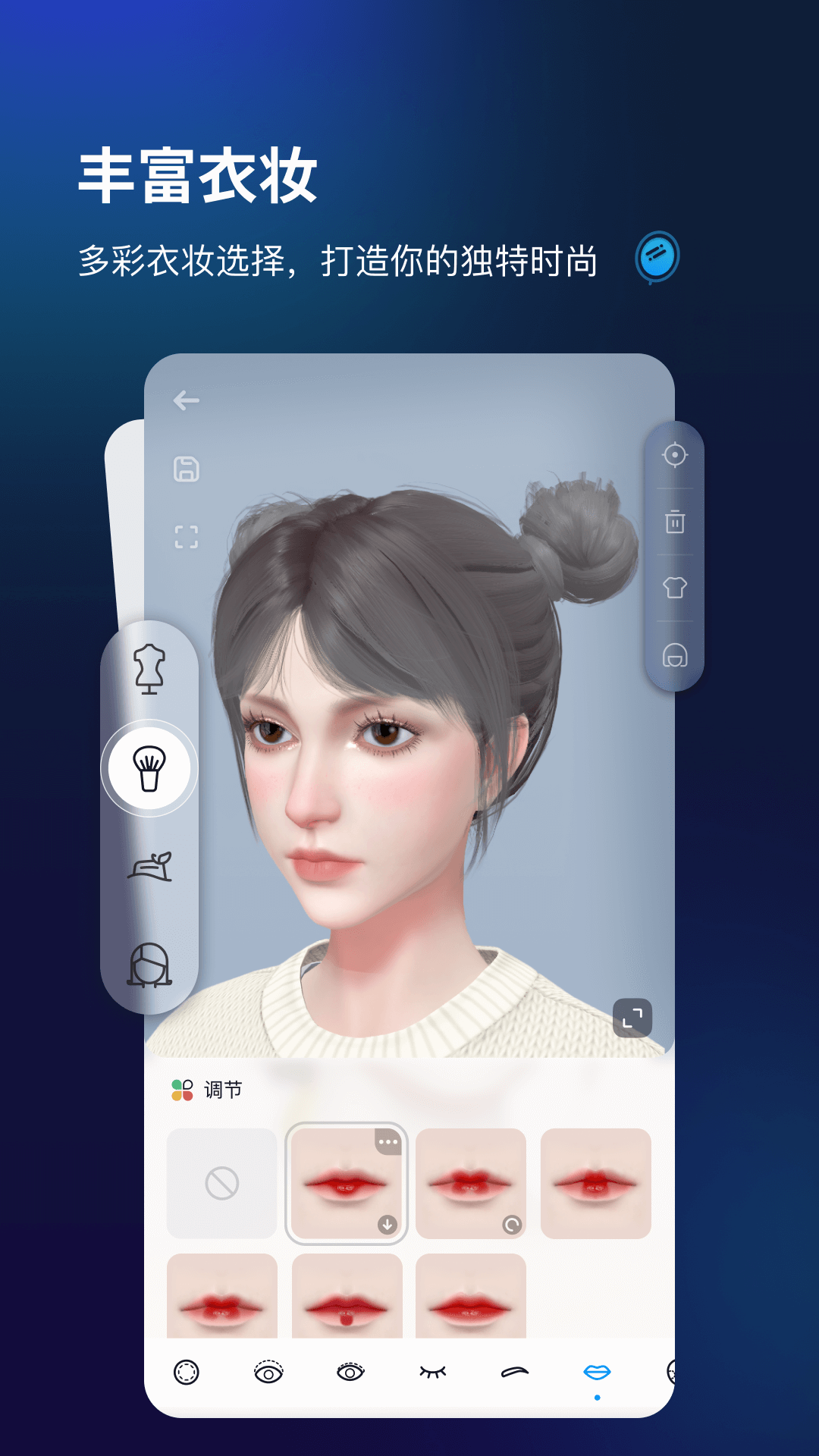 【丰富衣妆】「服装」古装、现代、科幻、未来多种时尚单品供你选择「化妆品」百余种妆容助你实现多彩美妆,创造属于你的时尚妆容「配饰」万千饰品为你点缀独特的美「发型」发型、染色、渐变你的头发你做主