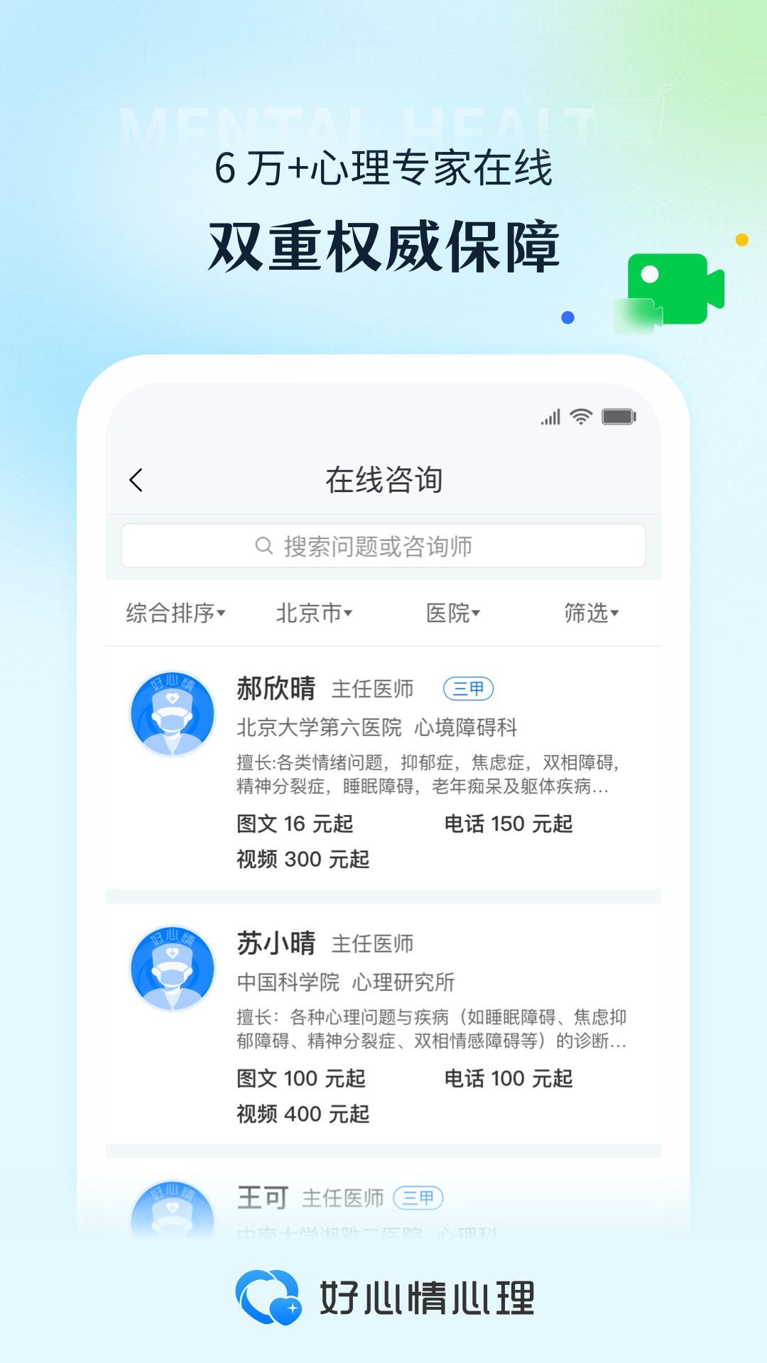 [心理测评]丰富的精神心理专业量表工具,完整的评估报告,帮你探索更多未知的自己。[心理咨询]从文字咨询到电话、视频咨询,从线上咨询到线下面询,贴心、及时、有效的咨询服务,帮你解决生活困扰。