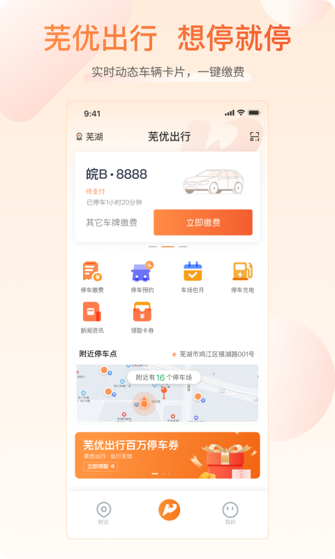 【附近找车位、找网点】:附近车场、网点智能推荐,距离、位置、价格、余位一目了然,一键导航【实时停车动态卡片】:停车状态、时长、费用实时更新,尽在掌握