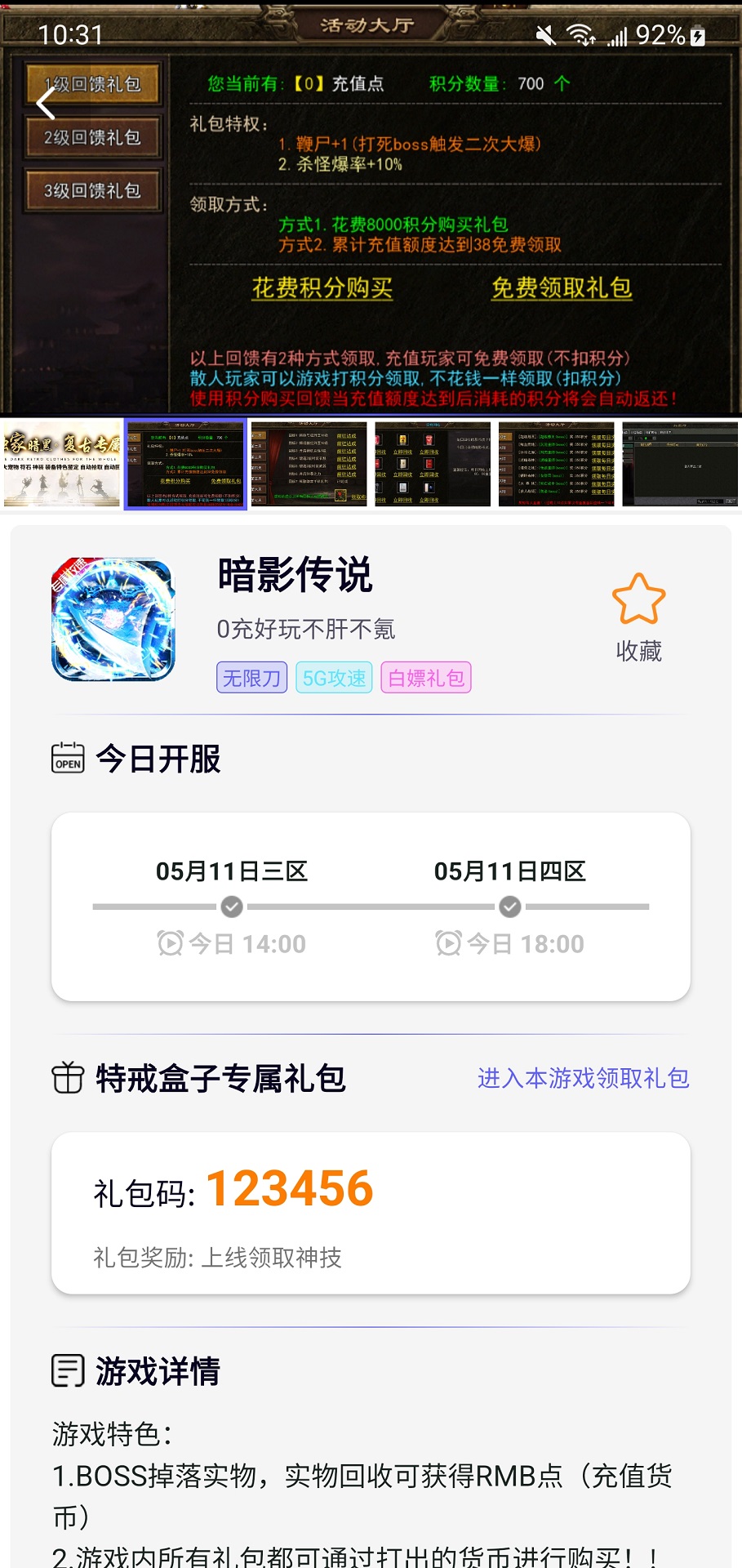 <福利多> 应用内游戏大部分都支持游戏专属礼包码, 可以在游戏兑换相应礼包将来, 增加游戏体验; 且用户可通过签到, 邀请等操作可获得特戒余额, 可兑换游戏内金币元宝, 进一步增加游戏体验<操作简单> 仅需应用注册账号和官网下载游戏账号保持一致, 可在应用内相应游戏详情界面, 兑换游戏内金币/元宝/资源到指定角色, 大大提升角色战力, 增加游戏体验