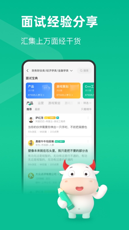 牛客是移动版IT求职神器,提供海量C++、JAVA、前端等职业笔试题库,在线进行百度阿里腾讯等互联网名企笔试面试模拟考试练习,和牛人一起讨论经典试题,全面提升你的编程能力,轻松搞定面试。