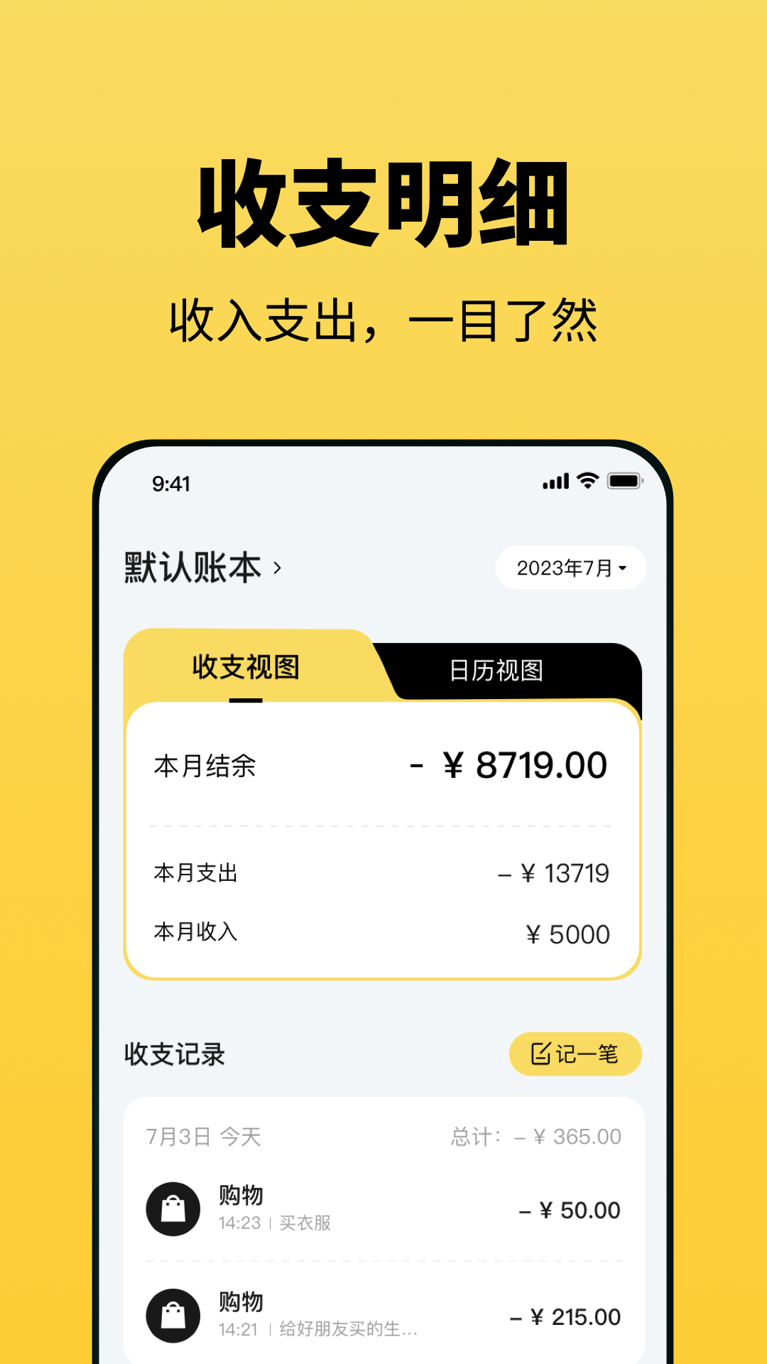 收支明细:清晰展示收入支出记录,让用户随时掌握资金流向,了解每一笔收支的具体情况。