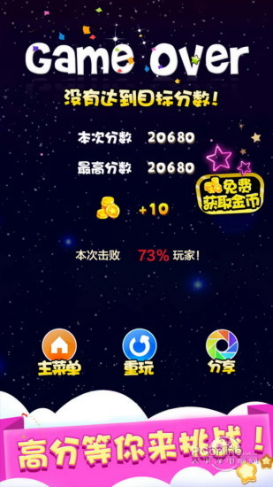 经典模式:完成每一个关卡的目标分后自动进入海滨假日下一关,连击消除大片乐心萌宠动物星星,完成糖果开心消消乐,将获得更高的分数。