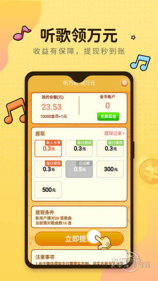 猜歌大神,猜歌赚取零花钱,提现秒到账。猜歌赢现金,福利多多,红包领不停!猜歌大神是一款猜歌曲名字的娱乐软件,拥有庞大的音乐资源库,应用界面也十分的精致清新,用户可以听到很多经典的歌曲,根据歌曲的旋律来猜出歌曲的名字。歌曲类目众多,喜欢音乐的你也赶紧来挑战下吧。 【应用特色】 1、听听好听又经典的歌曲猜出歌名,简单易上手 2、尽享海量精心挑选的经典歌曲600首,全面又经典 3、答题玩法设计,带来很轻松的娱乐方式,带来一系列最潮的音乐歌曲; 4、与全球猜歌爱好人士数据连通比积分,看谁才是真正歌王;