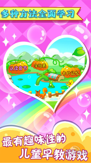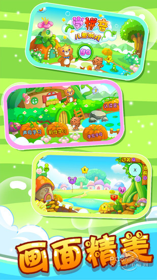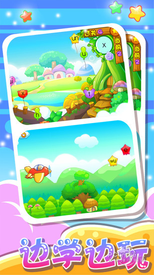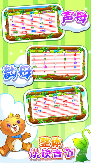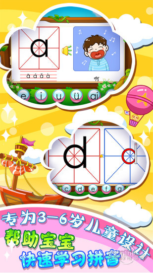 这是一款针对2至6岁学前儿童成长的特点,精心打造幼儿专属学拼音产品,其中设计的8个游戏模块: 1、声母学习(认识和学习声母的发音) 2、韵母学习(认识和学习韵母的发音) 3、整体认读音节(认识和学习声母韵母一起发音) 4、学写字母(练习每个字母的写法) 5、字母表(可以方便查看所有声母、韵母及整体读音) 6、卡片记忆(考验孩子的记忆力) 7、字母点击(根据右边提示点击正确的气球) 8、字母射击游戏(让宝宝驾驶飞机通过点击飞机前方出现的字母气球来发射导弹击落气球)每个模块都采用精美鲜艳生动的画质再配上甜美标准的真人发音,以达到更好的教学成果,让你的宝宝在轻松愉快的游戏中学习和成长。