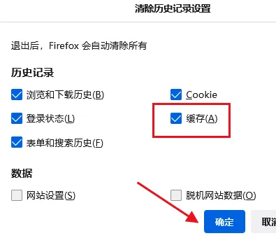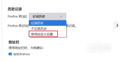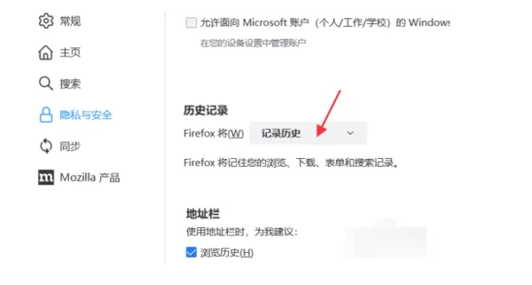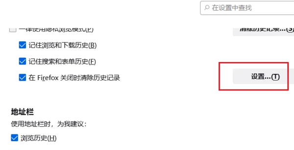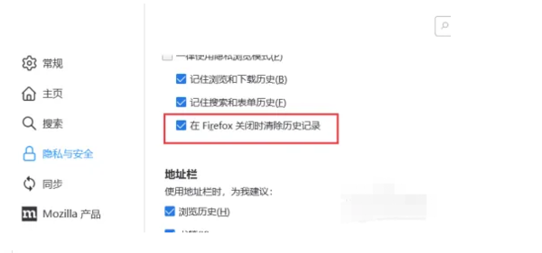 2、随后,会出现一些选项,我们找到【在Firefox关闭时自动清除历史记录】,勾选即可;