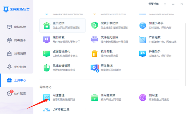 3、在2345安全卫士软件的工具中心界面中,点击【网速管理】,进入后也可以进入到2345网络流量的管理窗口,然后选择【测网速】即可。