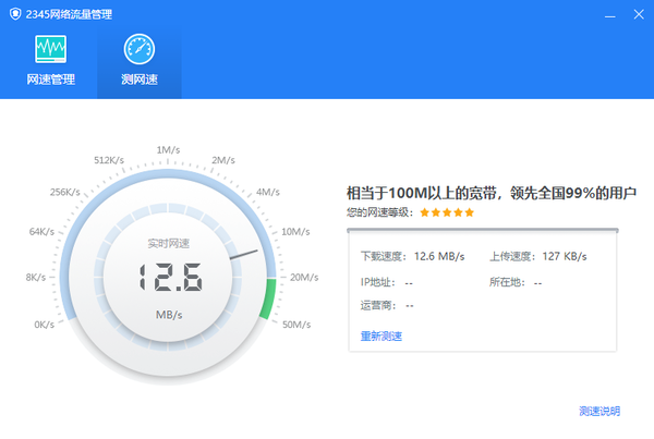 2、接着软件就会弹出2345网络流量的管理窗口了,接着等待15秒测速,等待测速完毕后,会显示当前状态下的实时网速、带宽、下载速度、上传速度等,这些可以全方位地让我们了解自己的网络状况。测试期间建议将其他占用流量的软件暂时关闭,这样测试出来的网速会更准确一些。