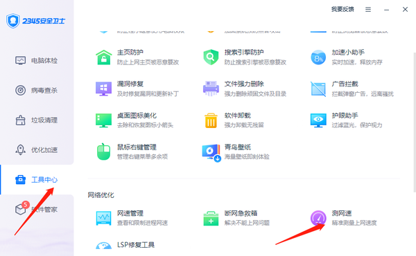 说起2345安全卫士大家肯定都不陌生,不仅支持病毒查杀、木马清理、漏洞修复、软件管理、垃圾清理等功能,而且还有很多实用的小工具,可以为我们提供非常多便利的服务,比如强力删除文件等等,那2345安全卫士可以测试网络速度嘛,毕竟我们在使用电脑的过程中,都会遇到过网速特别慢的情况,这个时候大家肯定想来测试一下网速,接下来小编就给大家解答一下吧。