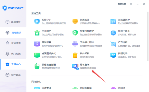 2345安全卫士找不到青鸟壁纸工具的原因一般是由于软件不是最新版本导致的,因为在2345安全卫士最新的8.6版本中,软件带来了壁纸工具,如果此时你的电脑的软件版本低于8.6的话,就看不到这个壁纸工具了。