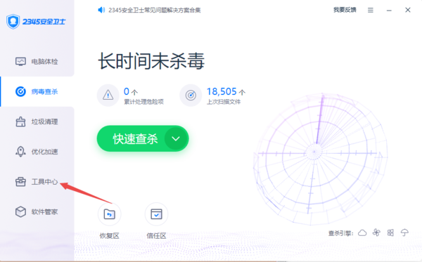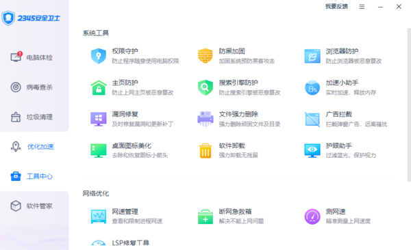 第一步,启动电脑端的2345安全卫士,点击界面左侧列表中的【工具中心】功能。