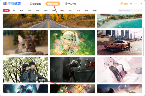 第三步,此时青鸟壁纸工具就会启动了,接着在【动态壁纸】或者是【静态壁纸】选项中,找到想要设置的壁纸图标,将鼠标光标放在图片上,然后选择【设为壁纸】选项。