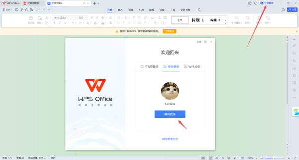 一、启动电脑端的WPS,点击界面顶部右上角的【立即登录】按钮,然后进行账号登录即可。