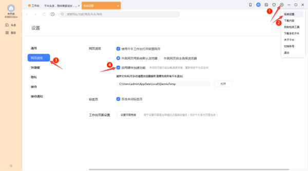 三、依旧是点击界面右上角的【小齿轮】设置图标,然后选择【系统设置】选项,接着选择左侧列表中的【网页浏览】选项,并勾选右侧界面中的【启用硬件加速功能】按钮,最后重启千牛,一般就可以解决问题了。