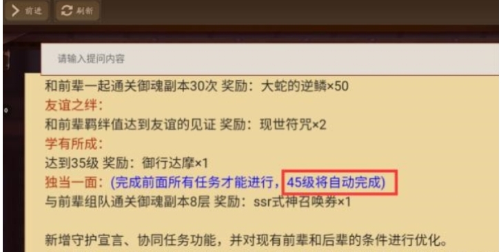 和前辈一起通关御魂副本30次可以获得“50个大蛇的逆鳞”,和前辈羁绊值达到友谊的见证可以获得“2张现世符咒”,达到35级可以获得一个“黑蛋”,与前辈组队通过御魂8层可以获得“随机ssr一个
