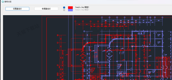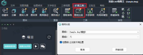 1.点击上方“扩展工具”下的“图纸比较”,勾选“在图纸1比较不同位置”然后开始比较。