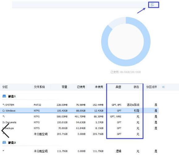 在分区助手专业版中,通过右上角的视图切换按钮,可以将默认的显示界面切换成更加详细的列表模式。 在该模式下,可以直观的看到磁盘每个分区的基本情况。而类型和状态一栏就决定了哪些分区是不能随便删除的。 图中,那个类型为“GPT,EFI”, 状态为“活动&系统”,这个分区,看似小,没什么作用,但是一旦将其删掉用作扩展C,那么,你的系统就完蛋了,只能通过PE修复了。