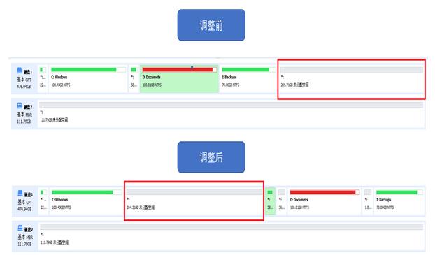 为顺利扩大C,只需一个目的,让C盘(前后)直接和“未分配空间“相邻。