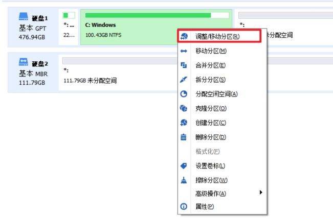 4)右键C分区,选择调整/移动分区,便可照下图方式使用全部的未分配空间用来扩大C。