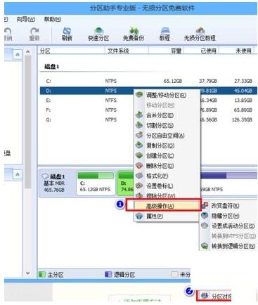 可以看到电脑中的D盘不是4k对齐的,在上面点击右键,选择高级操作-分区对齐。