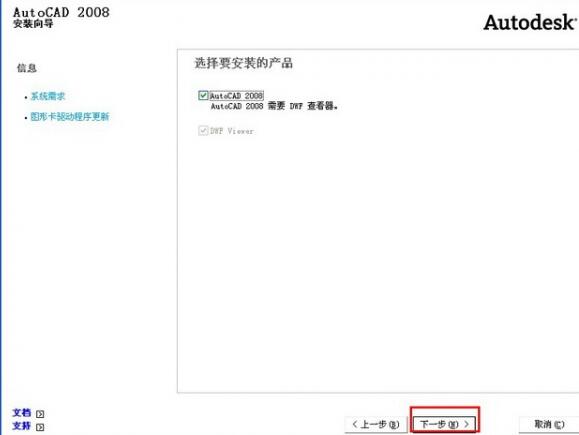 第五步:选择安装AutoCAD2008,勾选“auto CAD 2008”点击“下一步”继续。