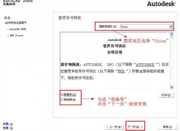 第六步:AutoCAD2008许可协议界面,在国家地区选择“China” 勾选“我接受”点击“下一步”继续操作。