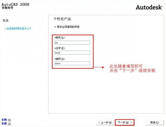 第七步:AutoCAD2008的用户信息,用户信息自己随意填写即可 填写完毕点击“下一步”按钮 。