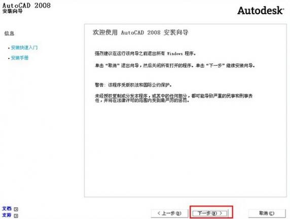 第四步:AutoCAD2008 32位中文版安装向导说明,点击“下一步”继续操作。