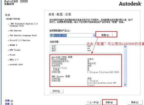 第八步:AutoCAD2008 32位中文版的配置-安装信息,红色框内是CAD2008的安装信息 点击“配置”可以自己设定,点击“安装”开始安装CAD2008 32位中文版。