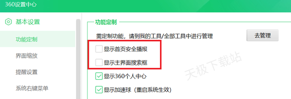 2.将“功能定制”的前两个选项“显示首页安全播报”和“显示主页面搜索框”取消勾选,剩下两个按需取消勾选。