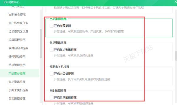 3.然后在“弹窗设置”中找到“产品推荐提醒”,将图中框住的四个选项取消勾选。