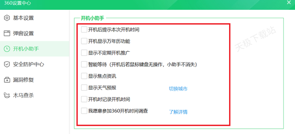4.然后选择“开机小助手”,将框住的所有选项都取消勾选,然后点击确定即可。
