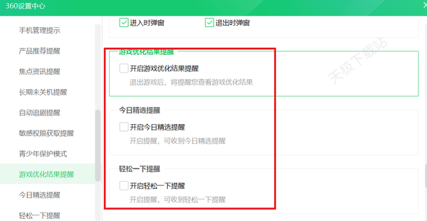 往下找到“游戏优化加过提醒”,将图中框住的三个选项取消勾选。