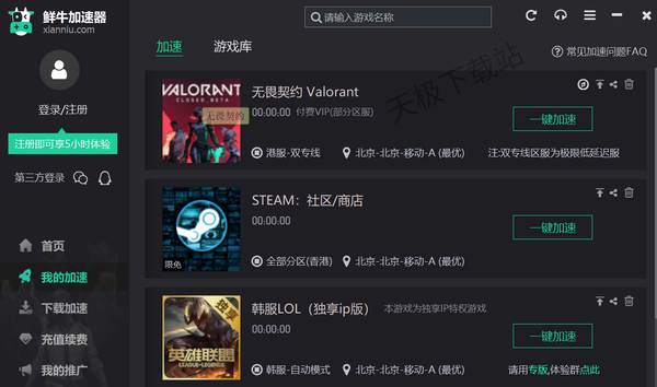 鲜牛加速器是一款专业游戏加速器,帮助玩家解决游戏延时过高、登录困难、容易掉线等多种问题,注册即可享受5个小时的免费时长,可以随时关闭,而且如果购买后觉得不好用,可以进行退货。