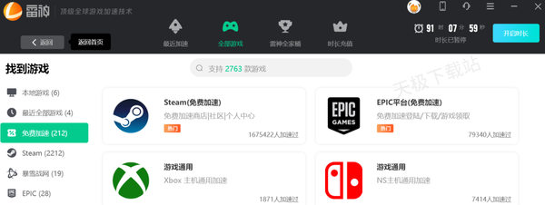 雷神加速器是一款兼容多平台网络游戏加速器,拥有稳定、低延迟、超高性价比的强大优势,可以随时开启和关闭加速时长,而且拥有多达212款免费加速的游戏和平台,包括常见的Steam,Epic商城。