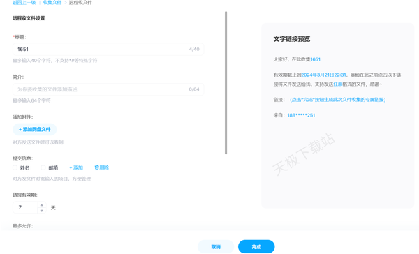 3.填写标题、简介、提交信息、链接有效期、文件类型等内容,点击“完成”。