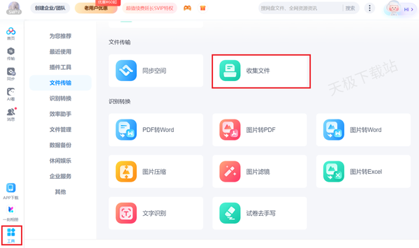 1.打开百度网盘客户端,点击左下角“工具”,找到“文件传输”中的“收集文件”。