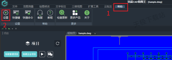 1.使用浩辰CAD看图王打开图纸,点击上方最右边“帮助”,选择“设置”。