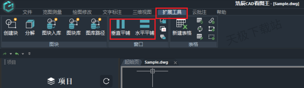 1.点击浩辰CAD看图王“扩展工具”下的“垂直平铺”或者“水平平铺”。