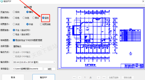 2.在对话框中奖图形颜色设置为“蓝色”,同时设置页面方向、线宽显示、图层信息等,然后点击输出PDF即可导出需要的工程蓝图。