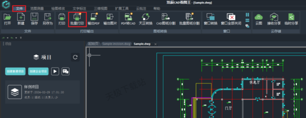 1.使用浩辰CAD看图王打开图纸,在上方“文件”选项下面找到并点击“批量打印”。
