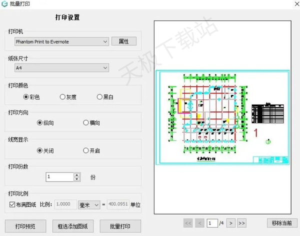 2.在对话框中依次调节好打印机、纸张尺寸、打印颜色、打印方向、线宽显示、份数、比例,完成后,选择“框选添加图纸”。