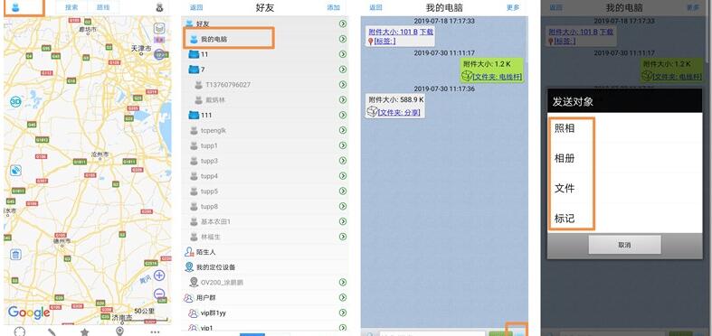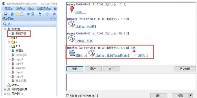 手机端操作:在账户登录的状态,电脑端发送数据后,手机端会立马收到。在[好友]页面下找到【我的电脑】,点击进入会话界面;点击【下载】,下载数据;点击数据,点击【收藏当前数据】,选择存放目录,点击【确定】,可将数据保存到电脑端的收藏夹中,同时数据会显示在地图上。