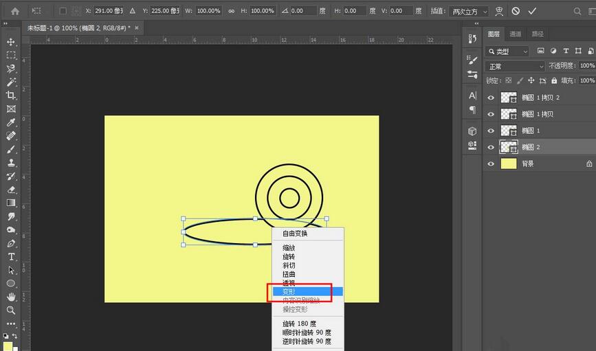ctrl+t选中长椭圆,右击找到变形并单击,单击后拖动手柄就可以变形了