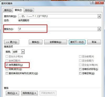 第一步:首先打开word文档,单击ctrl+H召唤出替换框,之后在查找内容中输入:、([!。:……?!)])^13{1,} 之后单击“更多”。
