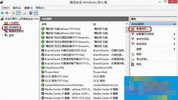 1、在控制面板中打开Windows防火墙,并点左侧的高级设置,打开后点左侧出站规则,再点右侧新建规则。